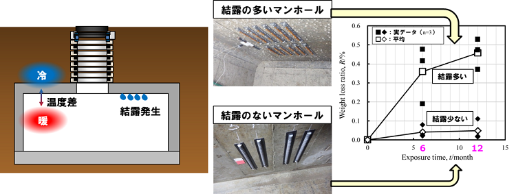 上床版の露筋の腐食速度を促進する要因を調査するために、実際のマンホールに温湿度計と、露筋を模擬した腐食量調査用の鉄筋サンプルを設置しました。その結果、上床版温度とマンホール内気温の間に温度差が生じ、結露が発生すること、そしてその結露があるマンホールの腐食量は大きいことが明らかになりました。鉄の腐食には酸素と水が必要ですが、結露によって水分供給がなされた結果、鉄の腐食速度が大きくなったと考えられます。