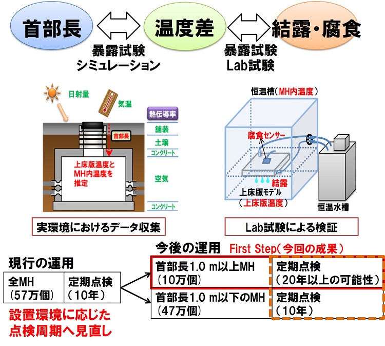 具体的にどの程度温度差が生じると結露が発生し腐食速度が大きくなるのか、ACMセンサを用いた実験により検証しました。その結果、結露は温度差が1℃以上になると腐食を促進させる程度までに成長することがわかりました。そこで、実際のマンホールにて温度差が1℃以上となっている時間を「結露時間」としたところ、「結露時間」はマンホールの首部長(深さ)と相関があることがわかりました。マンホール上床版温度と気温の間の温度差は、主に冬に地上の冷温が上床版に熱伝導することで発生しますが、首部長が長いと冷温があまり伝わらず、結露が発生しないためと考えられます。実際に首部長が110cm以上のマンホールは、腐食量が小さかったため、点検周期を20年へ延伸することが可能であるという知見を得ました。