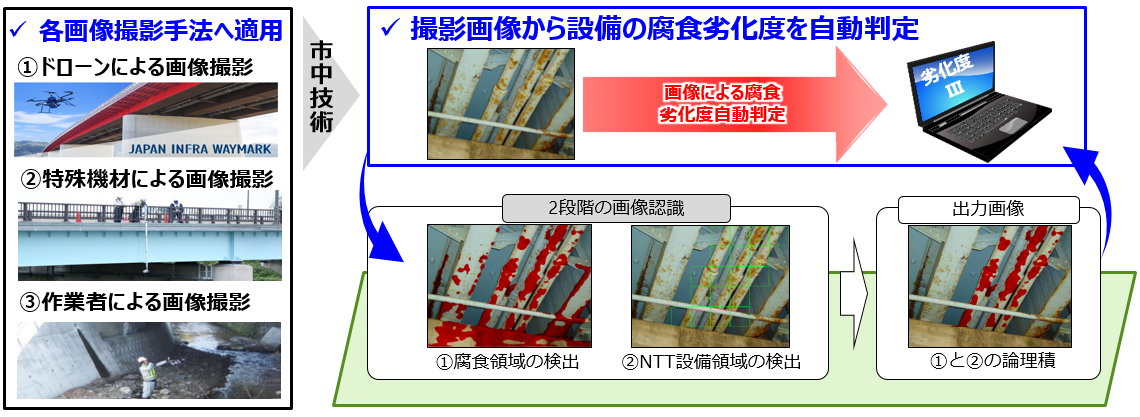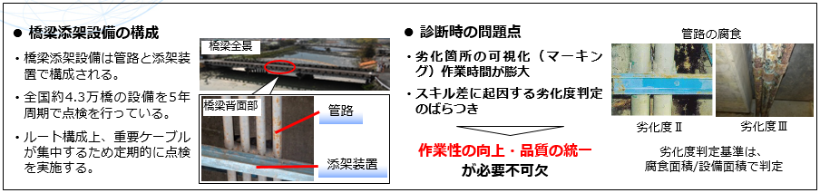 NTTグループは全国約4.3万橋に橋梁添架設備を設置しており、定期的にこれら全ての点検を行っています。現行の点検診断業務は、点検対象設備の現地画像を撮影し、事務所で全ての画像に対して劣化有無の判断や劣化箇所のマーキングを手作業で実施しています。現行手法は、作業者の判断による個人差や膨大な設備に対して劣化状態を確認する稼働面に課題があり、維持管理の効率化が求められています。
