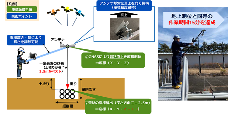 本技術はインフラ設備の高精度絶対座標管理に向けた中核技術である露出管路の絶対座標取得技術です。GNSS装置及び測量棒を利用することで地面よりも低い掘削溝内の管路の三次元座標を効率的に取得できます。