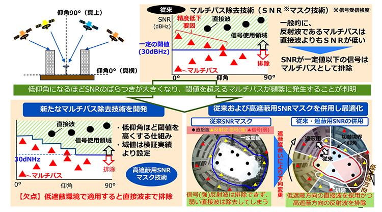 2点目は、都市部の高層ビル群等の上空遮蔽物により反射波(マルチパス信号)が発生しGNSSの信号受信精度が低下するという課題です。今回これらの課題を解決する技術を開発しました。