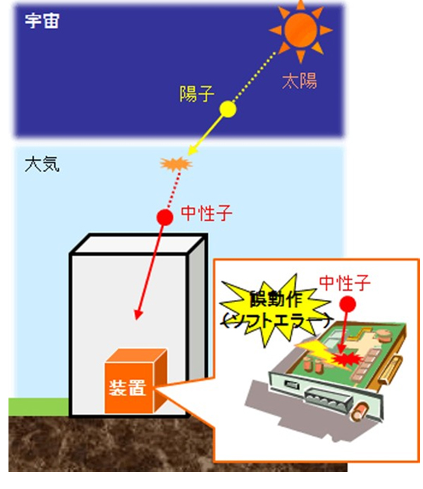 ソフトエラーとは、電気的ノイズによってメモリがビット反転する事象です。宇宙線が窒素や酸素などの原子核と衝突し中性子線を発生させ、その中性子線が装置内の半導体デバイス内のシリコン原子核と衝突を起こすことで電気的ノイズを発生させます(図1)。ソフトエラーによる故障(ソフトエラー故障)は、半導体デバイスの再起動やデータの上書きによって回復可能です。