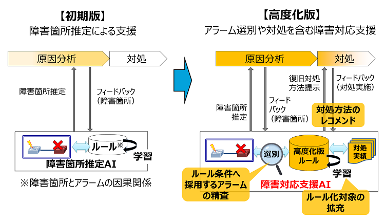 初期版で実現していたルール学習機能および障害箇所推定機能についてAI技術等を応用して高度化し、学習(ルール化)および推定可能な事例が増えました。また、障害箇所の推定だけでなく推定した障害に対して最適な復旧対処方法を同時に提示する技術を開発しました。