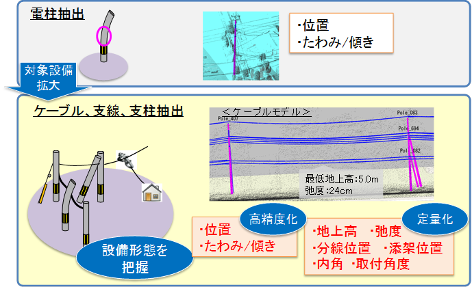 構造劣化判定技術の初期版では、レーザMMSを用いて取得した3D点群データから電柱の3Dモデルを抽出し、たわみによる劣化評価を可能としました。アクセス設備点検の対象は電柱のみならずケーブル・支線等もあり、効率的かつ定量的な判定による高精度化が求められます。