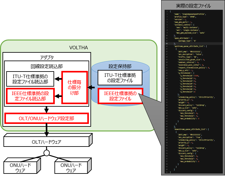 NTTアクセスサービスシステム研究所では、SEBAの構成要素であるVOLTHAに対してIEEE仕様の抽象化機能の実装を行い、OSS貢献を行いました。図2に回線設定に関わるVOLTHAの機能部を示し、OSSとして新たに実装した部位を赤枠で示します。VOLTHAにおけるアダプタ部は設定ファイルに応じたOLT/ONUハードウェアの回線設定を行う機能を持ちます。我々は、IEEE仕様に基づいたOLT/ONUの設定に必要なパラメータから、IEEE仕様準拠の設定ファイル形式を定義しました。また、回線設定読込部に関しても、形式の異なる設定ファイルを動的に読み込めるように、仕様毎の振分け部により適切な仕様の設定ファイル読込部で設定ファイルを解釈できるような実装を行いました。設定情報を実際のOLT、ONUのハードウェアに投入するため、IEEE仕様(SIEPON※ Package B)のハードウェアに対応したOLT/ONUハードウェア設定部の実装も行いました。これらのソフトウェアを用いて、実機のIEEE仕様のOLT-ONU間で主信号導通がされることや、設定入力が正しくハードウェアに反映されることを検証しました。