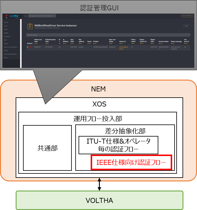 NTTアクセスサービスシステム研究所では、SEBAの構成要素であるNEMに対してIEEE仕様のアクセス装置の認証方式の抽象化する機能を実装し、OSS貢献を行っています。図3下部に運用フロー投入に関わるNEMの機能部を示し、OSSとして新たに実装した部位を赤枠で示します。NEMにおけるXOSは設定ファイルに応じたOLT/ONUハードウェアの制御・管理を行う機能を持ちます。我々は、IEEE仕様に基づいた、MACアドレス認証やIEEE802.1X認証を行うためのフローを差分抽象化部に実装しました。図3上部には認証に関わるパラメータの管理GUIを示しており、このような画面から認証パラメータを入力し、ONUの管理を実現しています。