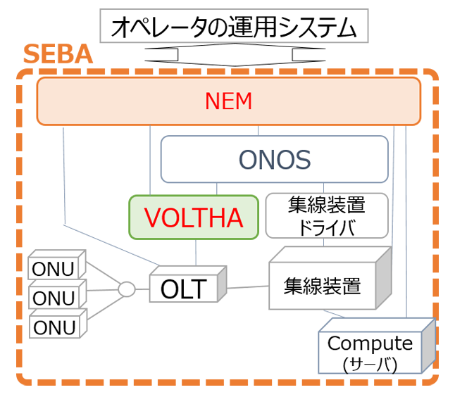 OSSの開発コミュニティであるONF(Open Networking Foundation)では、多様な光アクセスシステムの仮想化を実現するプラットフォームであるSEBA(SDN Enabled Broadband Access)(図1)の開発を進めています。SEBAの中の主要な構成要素としてVOLTHA(Virtual OLT Hardware Abstraction)、ONOS(Open Network OS)、NEM(Network Edge Mediator)があります。VOLTHAは多様なアクセス方式、ベンダ仕様に対して共通的な管理インターフェースを提供する抽象化機能を実現することを目指して設計されているソフトウェアです。また、VOLTHAはOpenFlowコントローラであるONOSや、運用システムからの投入情報を配下の構成要素に解釈できる形に変換するNEMを経由して制御されます。これらのソフトウェアの開発は2020年12月現在も進められており、オペレータの運用手順に応じた動作検証やソフトウェアの安定性の向上が図られています。