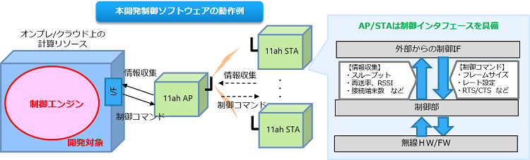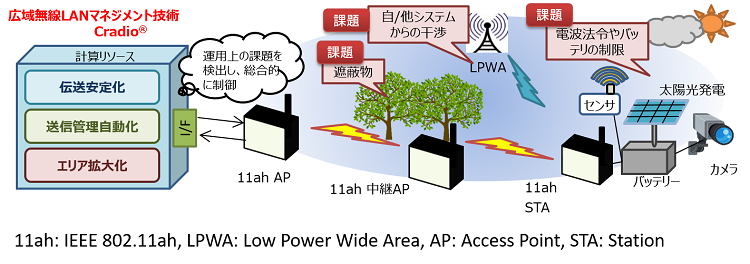 920MHz帯へのIEEE 802.11ah導入と運用には課題がありました。本技術では、11ah APを通しエリア内の端末から情報収集し、要求条件に沿って総合的に制御します。