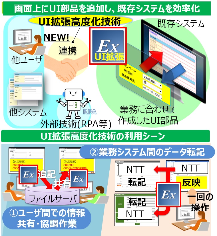 我々は、既存の1つのWebシステムを対象に、操作の簡易化や自動化などの機能を持つUI(拡張UIと呼称)をシステム画面に追加する、UI拡張技術を2019年に開発しました。