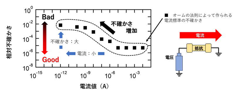 近年、微細加工技術や物理・化学などで利用される超高感度計測技術の発展とともに、フェムトアンペア(フェムトは1の1000兆分の1)からナノアンペア以下の微小な電流を精確に発生・測定することが求められています。現在、このような精確な電流測定を担保する電流の基準、すなわち"電流標準"は、量子力学的な現象を用いて実現される「量子ホール抵抗標準*3」と「ジョセフソン電圧標準*4」によって値を付けられた抵抗器と電圧源をオームの法則を介して結びつけることで実現されています。しかしながら、このような手法で実現される電流標準は、電流値が小さくなっていくにしたがって相対不確かさ*5が大きくってなっていくという問題があります(図1左グラフ)。ナノアンペア以下の微小電流では10-3以下の相対不確かさを持った電流標準は現在も実現していません。医療のための放射線計測や化学のための粒子計測など、高精度計測に必要な微小電流標準の実現が待たれています。