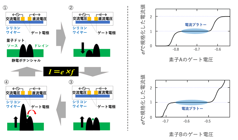 本研究では、微細加工技術によって大きさ数十ナノメートル程度の二つのシリコン量子ドット(素子A、素子B)を作製し、実験を行いました。素子の作製をNTTで行い、電流の精密測定を産総研で行いました。電流の発生には、まず二つのゲート電極に負の電圧を印加することで、シリコンのワイヤー中に量子ドットを形成します(図2左➀)。次にこの二つのゲート電極のうち片側に正の電圧を印加することで、シリコンワイヤー中のエネルギー障壁を低下させ、ソース側の電子を量子ドット内へと誘導します(図2左➁)。正の電圧を印加した電極に、今度は負の電圧を印加することで、ポテンシャルエネルギーを増加させ、量子ドット内に電子を一つだけ取り出します(図2左➂)。最後に負電圧を大きくすることで、量子ドットに閉じ込められた電子をドレイン側へと放出します(図2左➃)。この①から④の一連の動作を交流電圧によって連続的に行うことで、電子を一つ一つ移送して電流を発生させます。このとき発生する電流Iは、1秒間に運ばれる電子の個数f(個/秒)と電気素量e(1.602176634×10-19 C)の積(I = e × f )になります。図2右は、実際に二つの独立な素子によって、1秒間に10億個の電子を送り出し、発生させた電流をドレイン側の電圧に関してプロットした結果です。電流がゲート電圧に対して変化しない領域(電流プラトー)が形成されていることがわかります。実験では、この電流プラトーの精密な評価を行い、二つの素子ともに10-6以下の精度で理論的な値I = e × fと一致していることを確かめました。