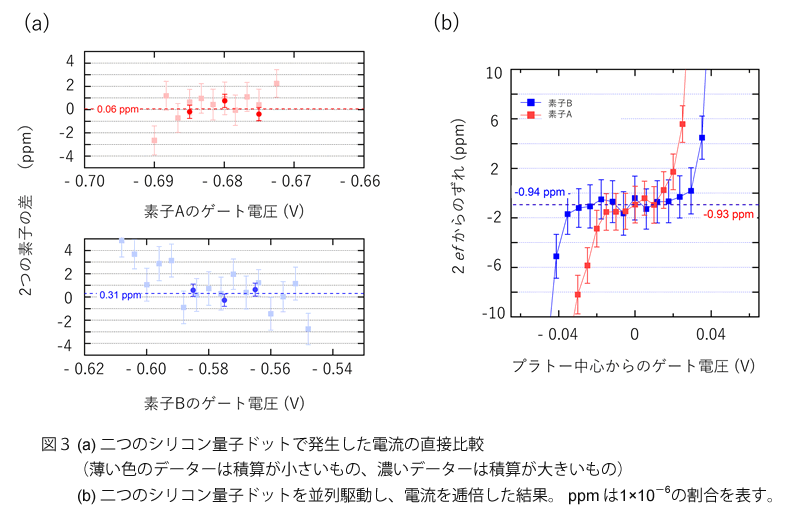 これらの結果は、異なる二つの独立したシリコン量子ドットによって発生した微小な電流が同等な値をとることを確認した初めての実験結果であり、今後、微小電流計測の精確性を担保する電流標準の実現に貢献する成果です。