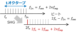 光コムのn本目の周波数fnの2倍波(SHG)を取ると、その周波数は2fnになります。これと光コムの2n本目の周波数f2nとの干渉信号を取ると、その周波数が2fn - f2n = fceoとなり、CEO周波数が検出されます。したがって、この方法では光コムがfnからf2nまで広帯域に広がっている必要があります。