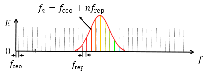 光周波数コム(光コム)※1は、周波数軸上でくし(コム)状の輝線スペクトルを持つ光信号であり、光の周波数計測や光からマイクロ波への精密な周波数変換などに利用されます。光コムの周波数間隔をfrep、光コムの周波数間隔を仮想的に0まで掃引したときに0からもっとも近い周波数(キャリアエンベロープオフセット周波数、以下CEO周波数)をfceoと定義すると、光コムの周波数fnは自然数nを用いて、fn = fceo + n × frepと記述できます(図2)。