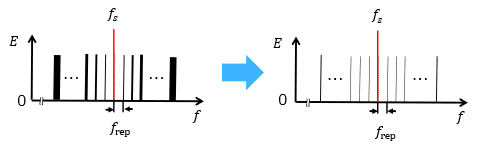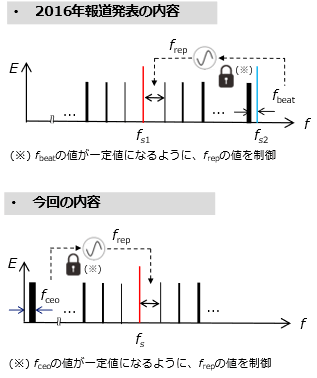 - 周波数の異なる2つのレーザー(種光源と参照用光源)を用い、マイクロ波のノイズが重畳したコムモードと参照用光源との周波数差(fbeat)が一定値になるようにマイクロ波へフィードバックすることで、frepの周波数安定化を実現しました。詳細は以下をご覧ください。