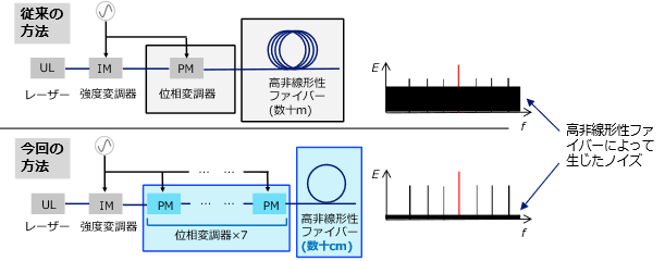 EOコムでは1パルスあたりのエネルギーが小さいため、通常長い高非線形性ファイバーを用いて広帯域な光コムを発生させます。一方で、この方法を使用すると光コムのSN比が小さくなり、CEO周波数の検出が難しくなります(検出方法については技術の詳細1を参照)。今回、7台の位相変調器※10を用いてサイドバンドを広げた後に、短い高非線形性ファイバーを用いることで、広帯域でSN比の高いEOコムを生成しました。