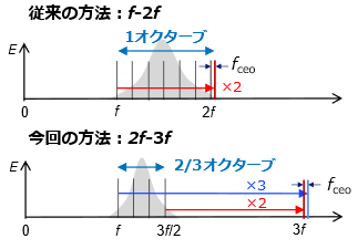 - 2/3オクターブ帯域の光コムでCEO周波数が検出可能な2f-3f自己参照干渉法の適用 (NTT) (図6)