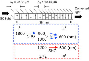 デュアルピッチPPLN導波路は、ピッチ長が2種類のPPLN(periodically poled lithium niobate)導波路であり、ニオブ酸リチウム(LiNbO3)が持つ非線形性を利用して波長変換を行います。デュアルピッチPPLN導波路の前段では、波長1800 nmから波長900 nmの2倍波(SHG)を発生し、後段で波長1800 nmと波長 900 nmの和周波(SFG)を発生することで、波長600 nmの3倍波を生成します。またこの導波路の後段では、同時に波長1200 nmから波長600 nmの2倍波(SHG)を生成します。したがって、2/3オクターブ帯域のEOコムをこの導波路に入射するだけで、2f-3f自己参照干渉法によるCEO信号の検出が可能です。
