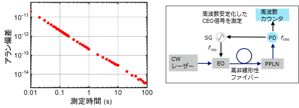 今回、研究グループはレーザー1台を種光源として利用し、EOコムではこれまで難しかったCEO周波数を検出し、その値が一定となるようにEO変調器に印加するマイクロ波周波数へフィードバックすることによって、EOコムのさらなる安定化に成功しました(図4)。