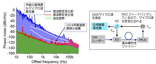 さらに、マイクロ波の位相ノイズを高精度な位相雑音測定器の測定限界以下まで低減化することに成功しました。これにより、マイクロ波発生・評価装置の精度向上やGPS信号が届きにくい場所でのタイムキーピング※16への活用が期待されます。
