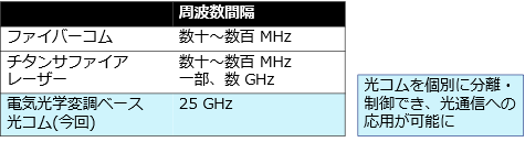 周波数が安定化された光コムは、ファイバーコム※2やチタンサファイア―レーザー※3を用いて実現されてきました。しかし、これらの光コムの典型的な周波数間隔(frep)は数十~数百 MHzであり、コムモード一本一本を個別に分離・制御できないため、光通信への応用※4は困難でした。