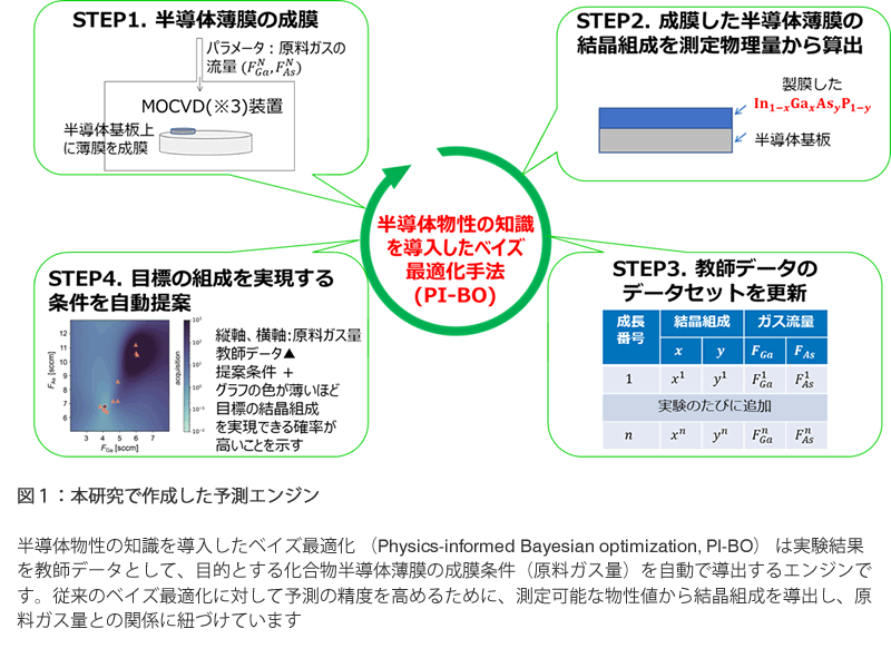 図1は化合物半導体薄膜の成膜条件を自動提案するための流れを示しています。自動化は以下の4つのSTEPで行います。