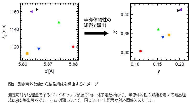 STEP2: 成膜した結晶の測定可能な物理量(バンドギャップ波長※6と格子定数※7)より結晶組成を導出