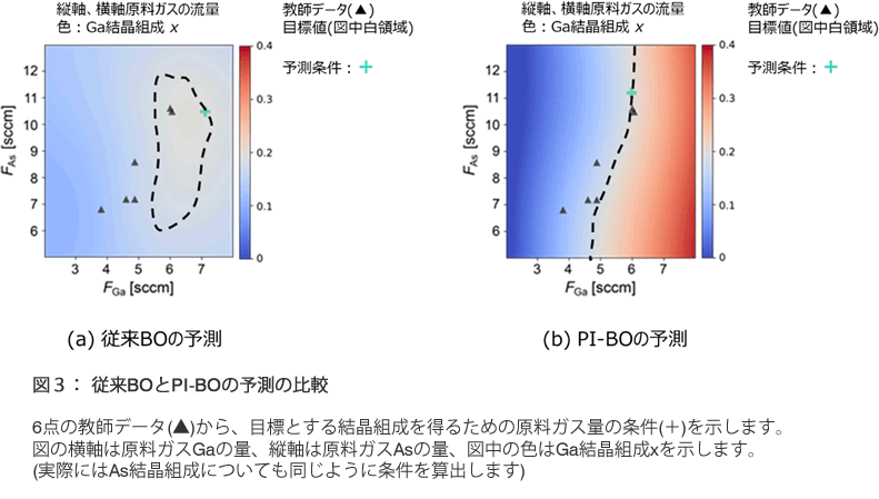 図3は従来BOとPI-BOの予測の比較を示します。横軸は原料ガスGa量、縦軸は原料ガスAs量、図中の色はGa結晶組成xを示しています。6点の教師データ(▲)から、ターゲットとするGa結晶組成xを実現する原料ガス量(+)を予測しています。ターゲットのxは0.1953であり、図中の白領域を示します。(a) 従来BOでは横軸が右に行くに従い青から白に変わり青になります。これは原料ガスGaが増えていくに従い、Ga結晶組成が増加した後減少することを予測しており、現実的には起こらない誤予測です。一方(b) PI-BOでは、横軸が右に行くに従い青から赤になります。これは原料ガスGaが増えていくに従い、Ga結晶組成が単調に増加することを予測しており、現実的な予測です。注目すべきは、従来BOでは予測を示す白い領域が破線のように広がっているのに対して、PI-BOでは該当する領域が青と赤の間の狭い領域にとどめられており、予測精度が高いことを示しています。