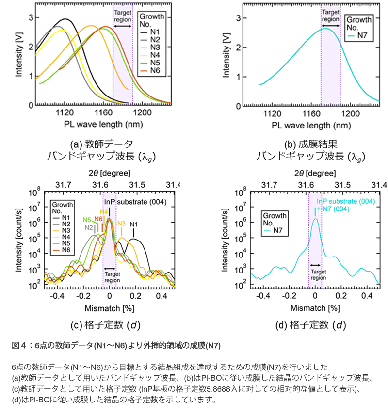 図4(a)は6点の教師データ(N1~N6)のバンドギャップ波長を示しています。ピークとなる点の波長をバンドギャップ波長として扱います。(b)は6点の教師データからPI-BOを行い導出した原料ガス量で成膜した結晶のバンドギャップ波長を示しています。(c)は6点の教師データの格子定数を示しています。中心がInP基板の格子定数を示しており、成膜した薄膜の格子定数がInP基板と整合していれば、中心以外のピーク(サブピーク)が観測されないことになります。(d)は6点の教師データからPI-BOを用いて導出した原料ガス量で成膜した結晶の格子定数を示しています。(b)で示すように、PI-BOで導出した条件で成膜した薄膜は、ターゲットとしているバンドギャップ波長の範囲に入っています。(d)で示すように格子定数についてもサブピークが観測されないためInPに整合(一致)する格子定数を有していること示しており、ターゲットとしている格子定数の範囲に入っています。つまり6点の教師データから目標とする1180 nm、InP基板と格子整合する結晶組成を1回で実現できたことを示しています。