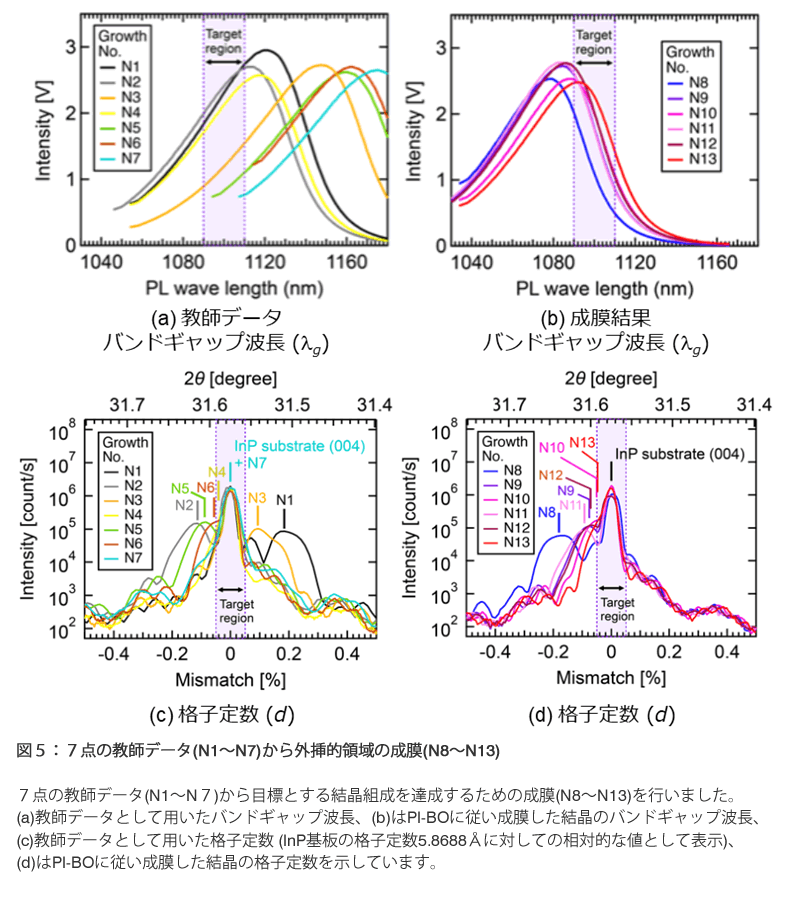図5(a)は7点の教師データ(N1~N7)のバンドギャップ波長を示しています。ピークとなる点の波長をバンドギャップ波長として扱います。(b)は7点の教師データからPI-BOを用いて導出した原料ガス量で成膜した結晶のバンドギャップ波長を示しています。教師データを用いて成膜する1回目(N8)を実施後、図1の流れに従いN8のデータも加えた形でPI-BOを行い、N9の原料ガス量を提案します。(c)は7点の教師データの格子定数を示しています。(d)は7点の教師データからPI-BOを行い導出した原料ガス量で成膜した結晶の格子定数を示しており、(b)での説明同様に成膜のたびにその結果を教師データに追加していきます。(b)で示すように、バンドギャップ波長としてターゲットとする範囲に対してN8では1080nm付近まで短波に動きますがその後ターゲット領域の波長に近づいていくことを確認しました。(d)についても同様で、N8においてはInPの格子整合から0.2%程度外れているが徐々にターゲット領域に近づいていくことを確認しました。3回目(N10)のバンドギャップ波長は1089 nmであり、3回目の実験でほぼ目標値±10nmに近い値に到達することを確認しました。4回目(N11)以降はターゲット収束する結果を確認しました。