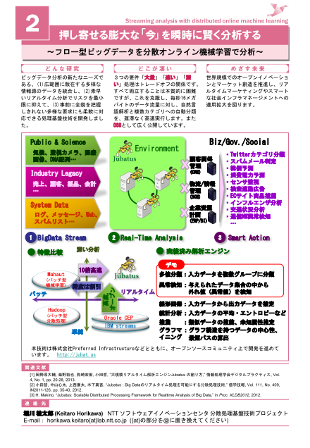 マイクロブログの書き込みのような,非定型のビッグデータをリアルタイムで分析することが,今までは得られなかった新たな情報を得る手段として脚光を浴びています.しかし,リアルタイム分析と柔軟で深い分析は,トレードオフの関係にあり,高いレベルで纏めることは困難でした.我々は分析の精度低下を最小限に抑えつつ,複数サーバでリアルタイムに分析可能なJubatusを開発しました.Jubatusは毎秒16MBの流量に対し,自然言語解析とデータの分類を,遅滞なく実行します.また,OSS公開することにより,世界規模でのオープンイノベーションを推進し,リアルタイムマーケティングやスマートな社会インフラマネージメントへの適用拡大を図ります.
