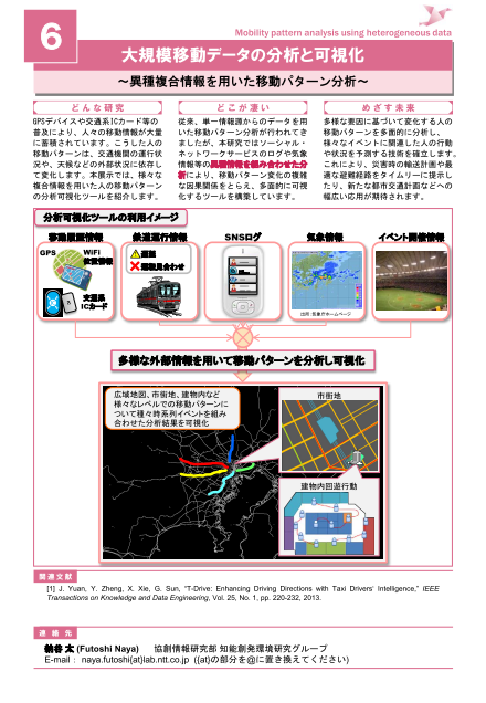 GPSデバイスや交通系ICカードの普及により,人の移動情報が大量に蓄積されています.こうした人の移動パターンは,交通機関の運行状況や,天候などの外部状況に依存して変化します.本展示では,広域地図,市街地,建物内などのさまざまなレベルの移動履歴情報に加えて,ソーシャル・ネットワークサービスのログや気象情報などの多様な外部情報を組み合わることにより,移動パターン変化の複雑な因果関係をとらえ,これを多面的に可視化する試みについて紹介します.