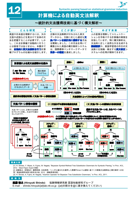英語や日本語を理解するには,文の主語や述語などを見分けて全体の文法を把握することが必要です.しかし,これを計算機で自動的に行うことは容易ではありません.我々は,正解の文法解釈が付与された英文データから,文脈に応じた適切な文法パターンを統計的に獲得する方法を開発しました.この方法を用いることによって,入力された文の文法パターンを自動的に解析し,英文法解釈を行うことができます.本技術は,文法的に正しく自然な文を生成する機械翻訳や,英語学習者の作文の文法誤りを指摘・修正する英文校正システムへの応用が期待できます.
