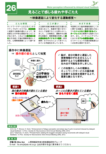 S. Ito, T. Kimura, H. Gomi, “Enhancement of fatigue perception and phase lag of cyclic movement induced by delayed visual feedback,” in Proc. Society for Neuroscience 42nd Annual Meeting (SfN), 2012.