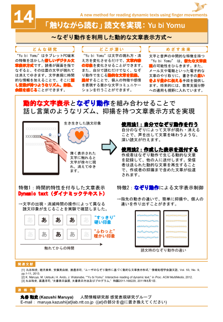 タブレットPC端末の特徴を活かした新しいデジタル文章表示方式です.読者が画面を指でなぞると,その位置に対応する文字が現れては消えてゆきます.文字表現に時間的な情報を加えることで,そこに話し言葉が持つようなリズム,抑揚,余韻を感じることができます.また,自分で読むだけでなく,なぞり動作で生じる動的な文章を記録,送付することで,個人の特徴や感情を表現する豊かな文字コミュニケーションを行うことができます.文字と音声の中間的な特徴を持つ本方式は,新たな文章表現の可能性を拓きます.