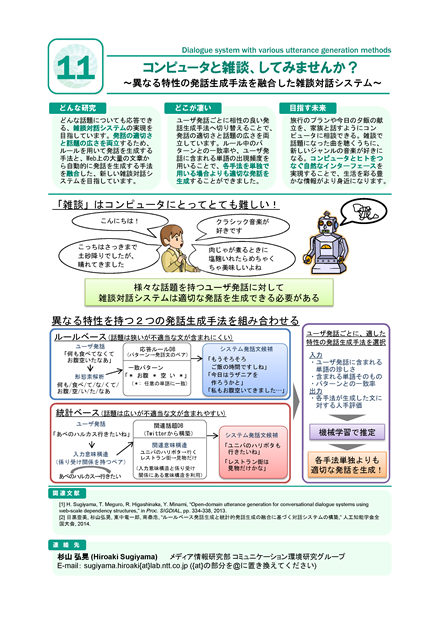どんな話題についても応答できる、雑談対話システムの実現を目指しています。発話の適切さと話題の広さを両立するため、ルールを用いて発話を生成する手法と、Web上の大量の文章から自動的に発話を生成する手法を融合するアプローチで研究を進めています。本研究では、ユーザ発話ごとにどの手法を用いるべきか推定し適切に切り替えることで、この融合を実現しています。ルール中のパターンとの一致率や、ユーザ発話に含まれる単語の出現頻度を用いて推定することで、各手法を単独で用いる場合よりも適切な発話を生成できることを確認しました。