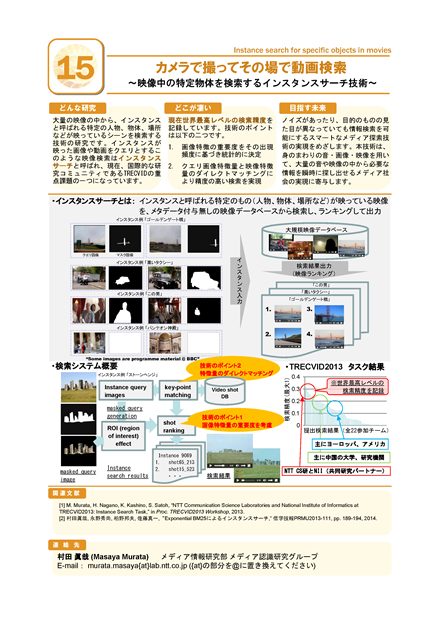 本研究は、探したい人物、物体、場所などが映った画像や映像をクエリとして、この目的のものと同じものが映っている映像を、大量の映像の中から検索する技術の研究です。このような映像検索はインスタンスサーチと呼ばれ、現在、国際的な研究コミュニティであるTRECVIDの重点課題の一つにもなっています。我々の提案検索手法は、クエリ画像の特徴点の重要度をその出現頻度に基づき統計的に評価しながら、クエリ画像の特徴点をデータベースの映像の特徴点と直接照合します。これによりTRECVIDのデータを使用した実験で,現在世界最高レベルの検索精度を記録しています。
