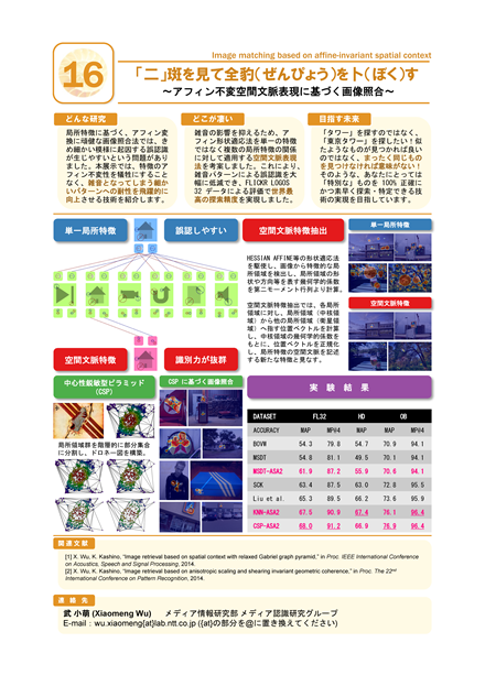 局所特徴に基づく画像照合は、回転等のアフィン変換に頑健である一方、きめの細かい模様から派生する雑音がある場合に誤認識が生じやすいという問題があります。この展示では、特徴のアフィン不変性を犠牲にすることなく、注目物体に無関係な雑音に対する耐性を飛躍的に向上させる技術を紹介します。具体的には、アフィン形状適応法に基づいた、局所特徴のペアを対象にした空間文脈特徴抽出法を新たに提案しました。従来技術と比べ、雑音特徴による誤認識を劇的に抑えることができ、FLICKR LOGOS 32データにおいて、現在世界最高の検索精度を達成しています。