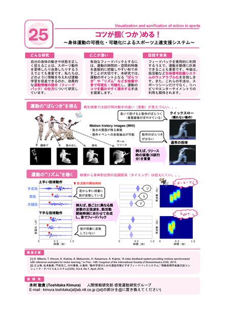 自分の身体の動きを正しく捉えることは、スポーツ動作を習得したり改善したりするうえでとても重要です。私たちは、どのように情報を与えれば運動の学習を促進できるのか、効果的な運動情報の提示(フィードバック)の仕方について研究しています。本研究では、運動の時間的・空間的特徴を直感的に把握しやすくするために、運動のポイントとなる「ばらつき」や「リズム」などを映像や音で可視化・可聴化し、運動のコツを掴みやすく提示する手法を提案しました。これらの手法は将来、スポーツシーンだけでなく、リハビリやエンターテイメントでの利用も期待されます。