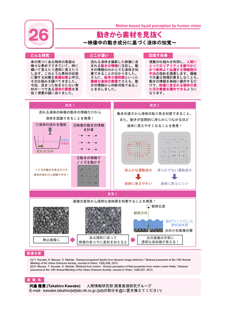 身の周りにある物体の表面は様々な素材でできていて、時に輝いて見えたり透明に見えたりします。このような素材の状態に関する知覚を質感知覚と呼び、その仕組みを調べてきました。今回、決まった形をもたない素材の一つである「液体」の質感を見抜く視覚の謎に迫りました。そして、人間が画像運動成分のみから液体を知覚できること、更には粘性や透明感などの液体質感を判断できることを明らかにしました。本研究を進めることで、複雑な物理計算をしなくとも映像の操作だけで質感知覚を操作できる技術の実現につながります。視覚の仕組みを利用し、人間にとってのリアリティを効率よく伝達する情報提示手法を提案していきたいと思います。