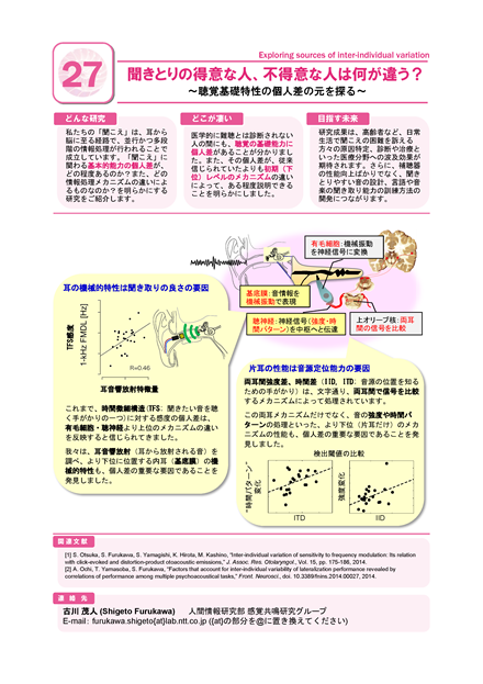 私たちは、これまでに「聞こえ」に関わる基本的能力の個人差が、どの程度あるのか?また、どの情報処理メカニズムの違いによるものなのか?を調べてきました。その結果、医学的に難聴とは診断されない人の間にも、聴覚の基礎能力に個人差があること、また、その個人差が、従来信じられていたよりも初期(低次)レベルのメカニズムの違いによって、ある程度説明できることを明らかにしました。この研究成果は、日常生活で聞こえの困難を訴える方々の原因特定、診断や治療といった医療分野への波及効果が期待されます。さらに、補聴器の性能向上ばかりでなく、聞きとりやすい音の設計、言語や音楽の聞き取り能力の訓練方法の開発につながります。