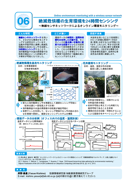 無線センサネットワークを用いて、さまざまな環境をモニタリングする研究を行っています。これまでに、環境データの時間的・空間的相関性を活用した圧縮手法、センサノードの振る舞いを動的に変更できる仮想マシンなどの技術について研究開発を行ってきました。これらの要素技術を組み合わせることで多様なフィールド環境で効率的かつ臨機応変にセンシングを行えます。本展示ではその一例として、近畿大学の農学部との共同実験で実施しているセンサネットワークを用いた絶滅危惧種の魚の生息環境センシングを紹介します。本技術を用いることで長期間にわたって詳細な環境データを計測・蓄積・分析することが可能になります。