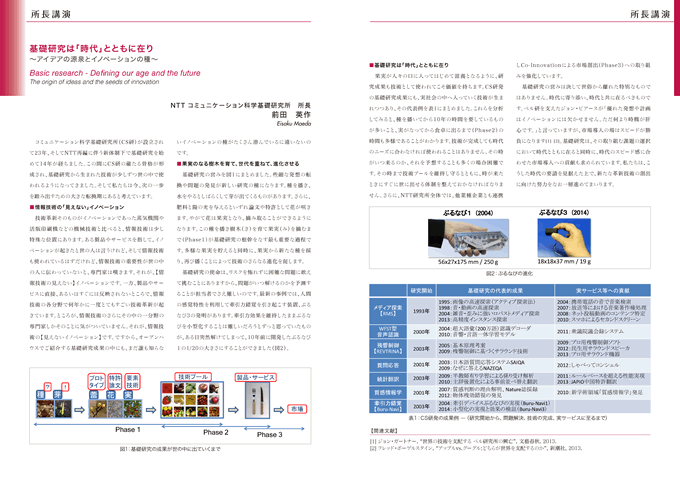 果実が人々の口に入ってはじめて滋養となるように、研究成果も技術として使われてこそ価値を持ちます。CS研発の基礎研究成果にも、実社会の中へ入っていく技術が生まれつつあり、その代表例を表1にまとめました。これらを分析してみると、種を播いてから10年の時間を要しているものが多いこと、実がなってから食卓に出るまで(Phase 2)の時間も多様であることがわかります。技術が完成しても時代のニーズに合わなければ使われることはありません。その時がいつ来るのか、それを予想することも多くの場合困難です。その時まで技術プールを維持し守るとともに、時が来たときにすぐに世に出せる体制を整えておかなければなりません。さらに、NTT研究所全体では、他業種企業とも連携しCo-Innovationによる市場創出(Phase 3)への取り組みを強化しています。