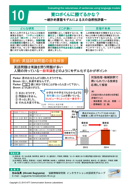 東大に入学できるような人工知能の実現を目指す、「ロボットは東大に入れるか(東ロボ)」プロジェクトに英語担当として参加し、実際の試験問題に自動的に解答するシステムの研究を進めています。英語問題に正しく解答するには、常識を正しく理解する必要があります。しかしこれは、人工知能にとってはとても難しい問題です。私たちは、NTTがこれまで培ってきた、対話処理・機械翻訳の技術を応用することで、昨年の代ゼミセンター模試において、実際の受験生の平均点を超える成績を達成しました。