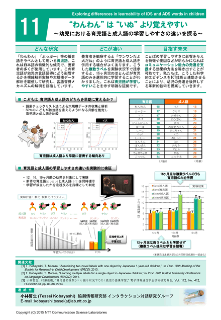 「わんわん」「ぶっぶー」などの擬音語をラベルとして用いる育児語。これは日本語の特徴的な傾向で、養育者の多くが使用しています。私たちは、この育児語が幼児の言語習得にどのように影響するかを視線解析実験や大規模データ解析などを駆使して研究し、育児語の学習しやすさ、そしてその背後にある言語習得メカニズムについて多面的な側面からの解明を目指しています。