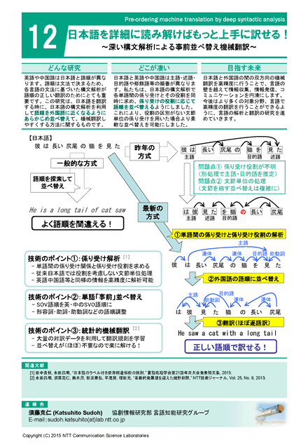 日本語と外国語は語順が異なるため、日本語を外国語に翻訳するときには語句だけでなく語順も外国語のものに合わせる必要があります。しかし、機械翻訳ではこの自動的に行う並べ替えの間違いが多く、正しい語順で翻訳できないことがあります。私たちは、日本語の単語間の係り受けとその役割を同時に求める構文解析方式を実現し、外国語の文法に合わせた語順に正確に書き換えることで、高精度に外国語への翻訳ができるようにしました。