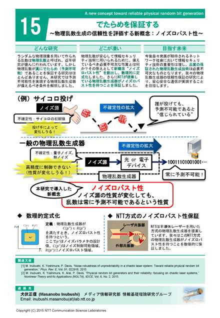なぜサイコロは誰が投げてもでたらめ(予測不可能)な目を出すと言えるのでしょうか?この基本的な問題は、物理乱数生成器の信頼性を保証する上で極めて重要であることを我々は見出しました。物理乱数はランダムな物理現象から生成される乱数であり、情報セキュリティの重要な要素技術として近年関心を集めています。我々はサイコロ投げが備えているような物理乱数生成器の性質の重要性を指摘し、その本質を抽出した『ノイズロバスト性』概念を創出、数理的に定式化しました。ノイズロバスト性は物理乱数生成器の信頼性保証に必要不可欠な性質です。この性質を備えた物理乱数生成器を設計・開発することで、より安心な情報化社会が実現されます。