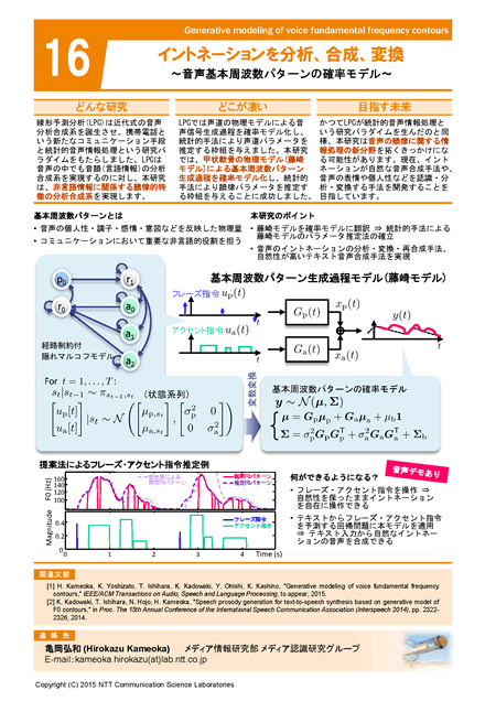線形予測分析(LPC)は近代式の音声分析合成系を誕生させ、携帯電話という新たなコミュニケーション手段と統計的音声情報処理という研究パラダイムをもたらしました。LPCは、言語情報に関係する音韻的特徴の分析合成系を実現するものであったのに対し、本研究は、非言語情報に関係する韻律的特徴の分析合成系の実現するものです。LPCでは声道の物理モデルによる音声信号生成過程を確率モデル化し、統計的手法により声道パラメータを推定する枠組を与えました。一方、本研究では甲状軟骨の物理モデルによる基本周波数パターン生成過程を確率モデル化し、統計的手法により韻律パラメータを推定する枠組を確立しました。現在、提案モデルを用いた音声合成手法や韻律の分析再合成手法を開発しています。