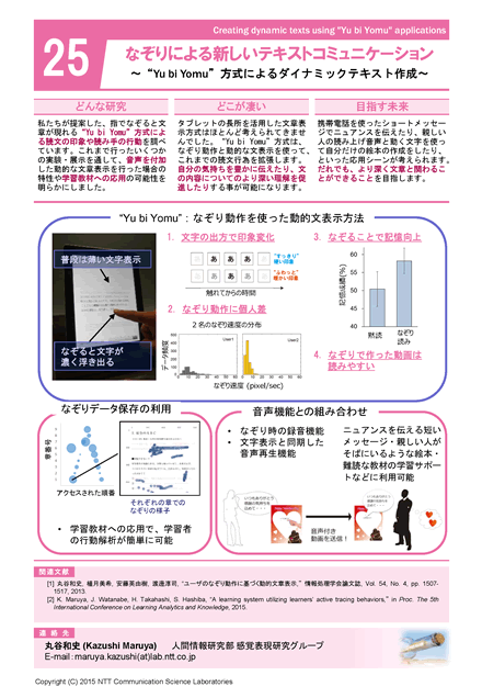 文章をなぞる動作で、文章が現れる速度を制御する”Yu bi Yomu”方式を使った読文の特性を調べています。”Yu bi Yomu”方式は、なぞり動作と動的な文表示を使って、読文行為を拡張します。これまでに、音声を付加した動的な文章表示を行った場合の読みやすさの向上や学習教材への応用の可能性を明らかにしました。”Yu bi Yomu”方式を使うと、自分の気持ちを豊かに伝えたり、文の内容についての深い理解を促進したりする事が可能になります。ショートメッセージでより細かなニュアンスを伝えたり、親しい人の読み上げ音声と動く文字を使って自分だけの絵本の作成をしたり、といった応用シーンが考えられます。