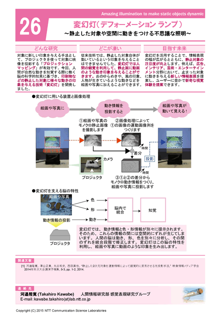 身近な事物に新しい印象を与える手法として、プロジェクタを使って対象に映像を投影する「プロジェクションマッピング」が有効です。プロジェクションマッピングでは、対象の表面をキャンバスとして様々な視覚効果を生み出すことができますが、従来技術では止まった対象自体が動いているという印象を与えることはできませんでした。今回、人間が自然な動きを知覚する際に働く視覚情報処理の科学的知見を応用し、印刷物などの止まった対象に様々な動きの印象を与えることのできる技術「変幻灯」を開発しました。「変幻灯」では錯覚を利用して、炎のゆらめきや、風の印象、人物が生きているような動きなどを絵画や写真に加えることができます。